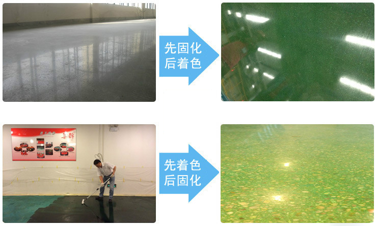 4.固化:染色施工后,将地面干燥24以上,然后在地面涂抹密封固化剂,浸润一定时间后,清洗地面干净进行打磨;